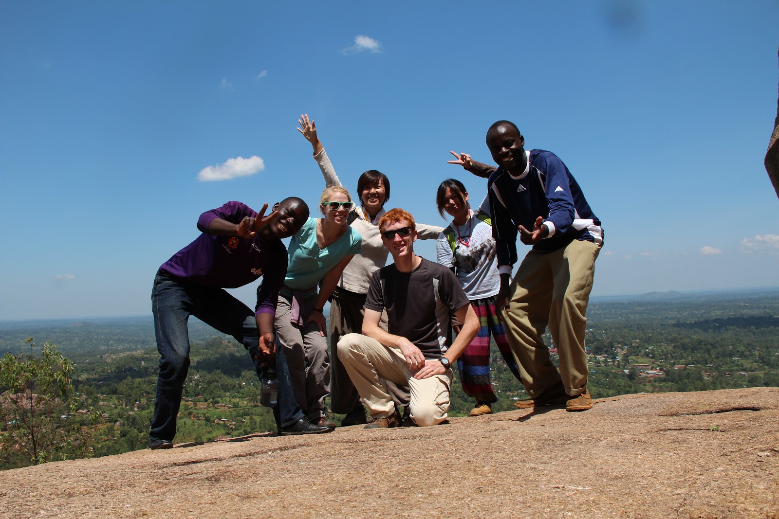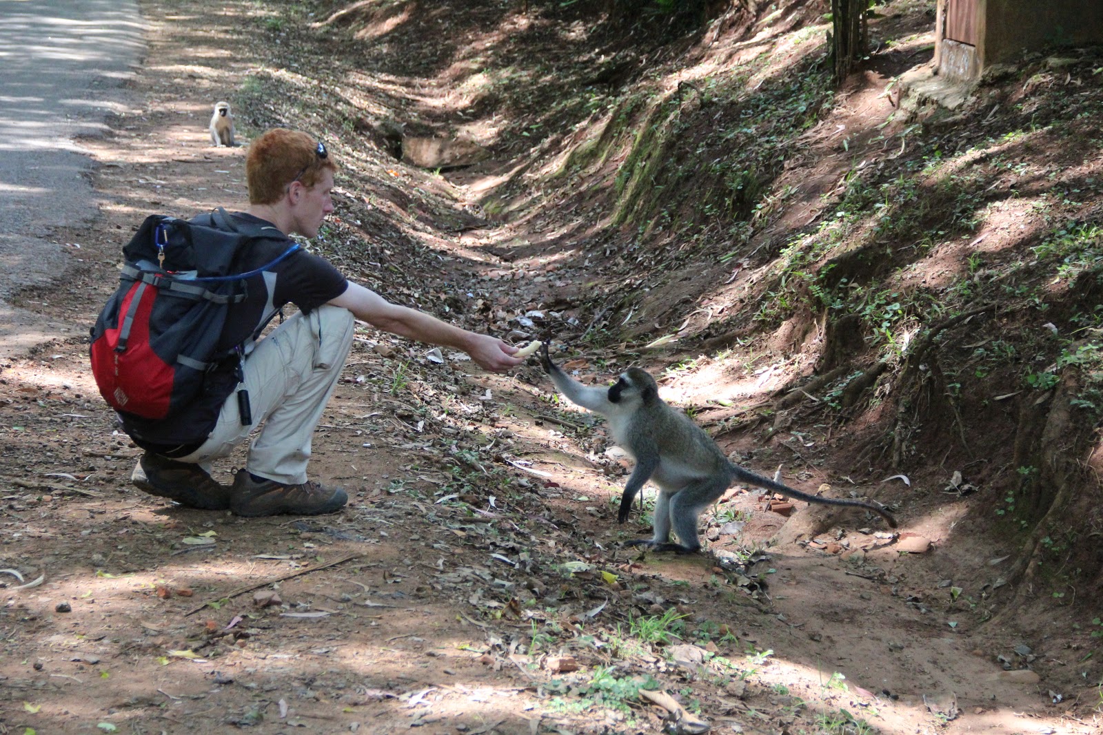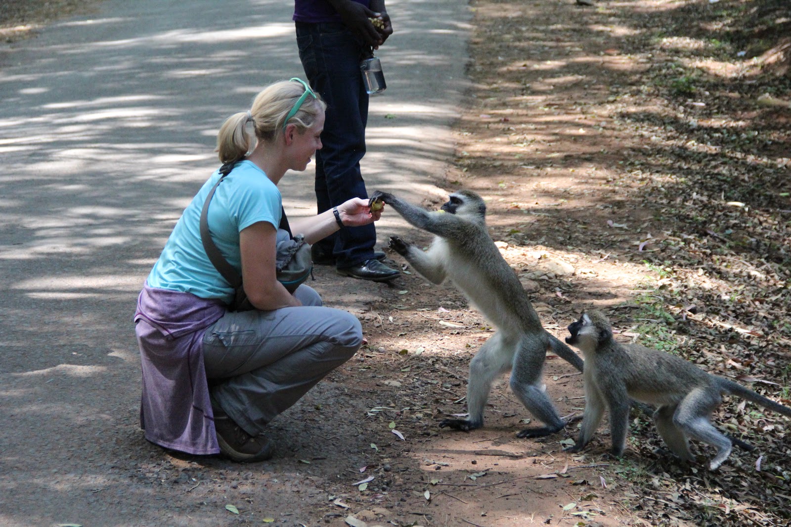 Last weekend, instead of a trip to Kisumu like the last two weekends, we did a day-long hike with Julius, Guddy, Mariko, and Yumi over the rocky hills near Kima to Maseno. Maseno is home to Maseno University and dozens, if not hundreds, of small monkeys who have become rather domesticated. After Julius and Guddy led us down the meandering path through the hills to the campus, we bought 15 or so bananas and searched for the monkeys for all of about 10 minutes. It didn't take much coaxing for the monkeys to come right up and take them from our hands...bananas are pretty delicious afterall. After Maseno, we had to refuel ourselves with some fresh fruit juice before heading for the Equator, which was on the way to Guddy's mother's house. We had lunch with his mom and sister and relaxed while the thunderclouds moved in. A short matatu ride back to Kima gave our legs a break after a long day on our feet. Julius enlightened us that this was not much walking in a day for those in Kima, but it is more than I walk in a week back home if I am not doing something active. Erin and I both had a blast though and the views were amazing. It was great to see the countryside upclose along with the monkeys and the Equator and Guddy's mom's just topped it all off for a great day.